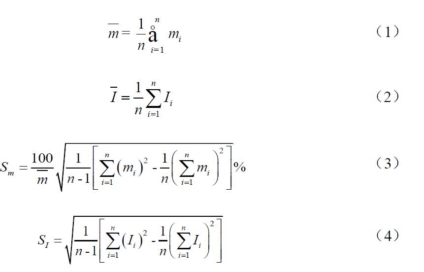多點校準的平均斜率與平均截距分別按公式(1)和公式(2)進行計算;多點校準斜率的相對標準偏差和截距的標準偏差分別按公式(3)和公式(4)進行計算。